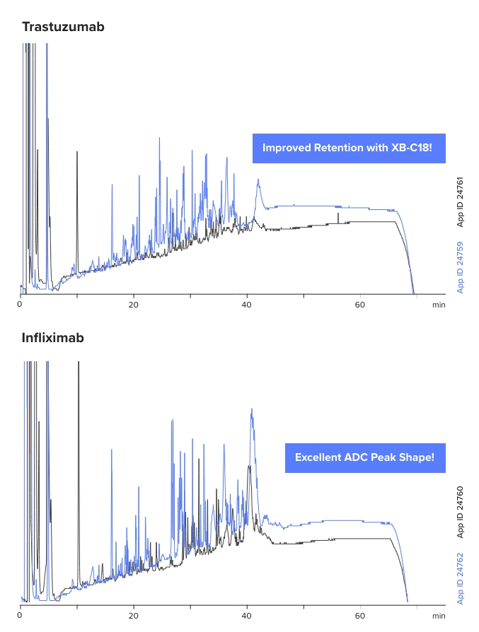 Digested mAbs or ADCs typically include a large body of compounds which are crucial to understanding post translation modifications. So we designed our Biozenâ„¢ Peptide columns to offer highly useful and unique retention profiles. Biozen Peptide XB-C18 allows for fast and effective elution windows by utilizing core-shell particles to gain sharper peaks, better peak capacities, and overall higher sensitivity.