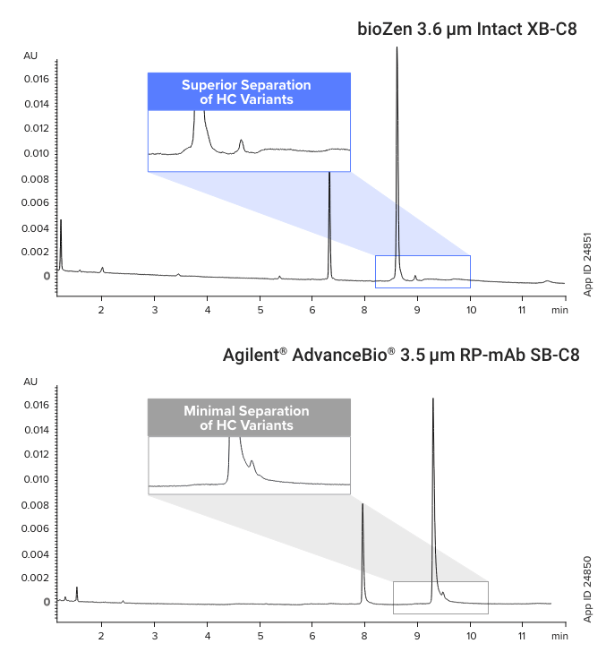 With a direct effect on efficacy and safety, conjugation for each ADC must be well understood. The bioZen Intact XB-C8 provides an excellent vehicle for determining drug load distribution and DAR for ADCs. Its large pore size allows intact ADCs to interact with a moderately retentive stationary phase while the core-shell particle supplies increased efficiency to deliver the required resolution between ADC species with differing drug loads.
