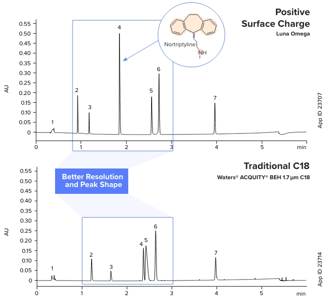 Luna Omega PS C18 is a unique mixed interaction stationary phase that provides incredibly useful polar and non-polar retention. The surface of the PS C18 contains a positive charge which aids in the retention of acidic compounds and provides better peak shape for bases through ionic interactions, while the C18 ligand promotes general reversed phase retention. This mixed-mode selectivity allows for greater separation between compounds with varying functional groups.