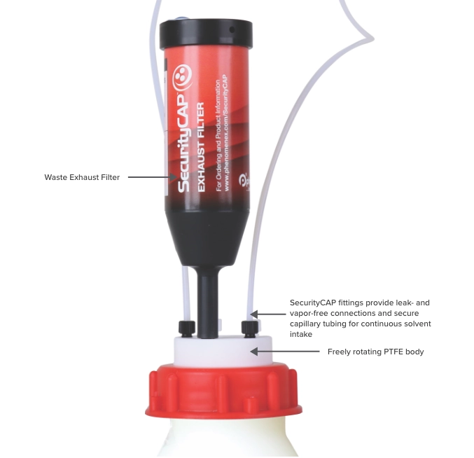 The SecurityCAP mobile phase and solvent waste safety caps can be used with reusable mobile phase bottles and solvent waste containers. They prevent dangerous vapors and gases from leaving HPLC/UHPLC solvent reservoirs.