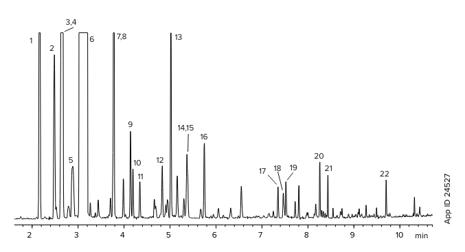 Sample was 10 % in dichloromethane1. α-Pinene 2. β-Phellandrine 3. β-Myrcene 4. Octanal 5. 3-Carene 6. Limonene 7. Nonanal 8. Linalool 9. cis-Limonene oxide 10. trans-Limonene oxide 11. Citronellal 12. α-Terpineol 13. Decanal 14. Carvone 15. Neral 16. Geranial 17. α-Cubebene 18. β-Cubebene 19. Dodecanal 20. Valencene 21. Cadinene 22. Nootkatone |