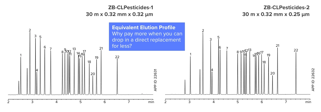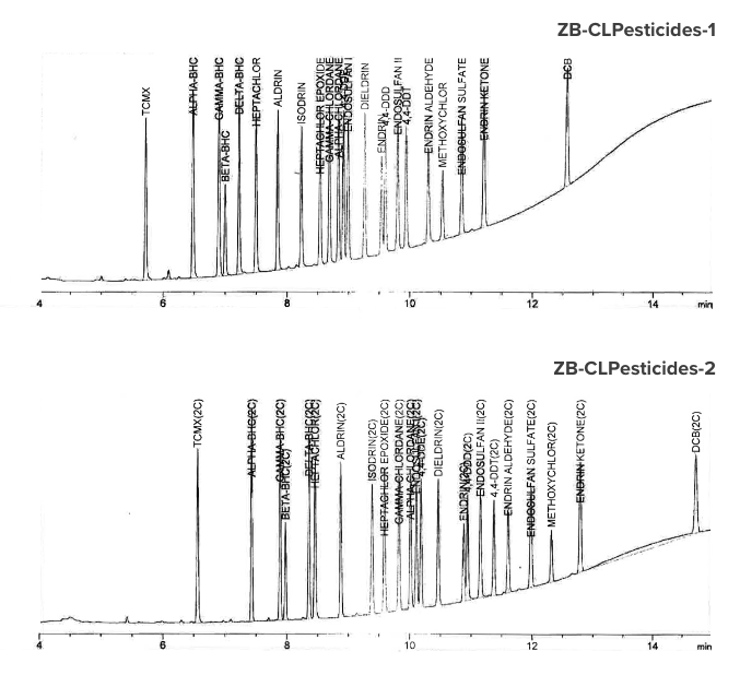ZB-CLPesticides columns combine Zebron high quality with drop-in selectivity. Achieve near-exact elution profiles and run times, without the time-consuming method development and headaches typical of traditional selectivities!